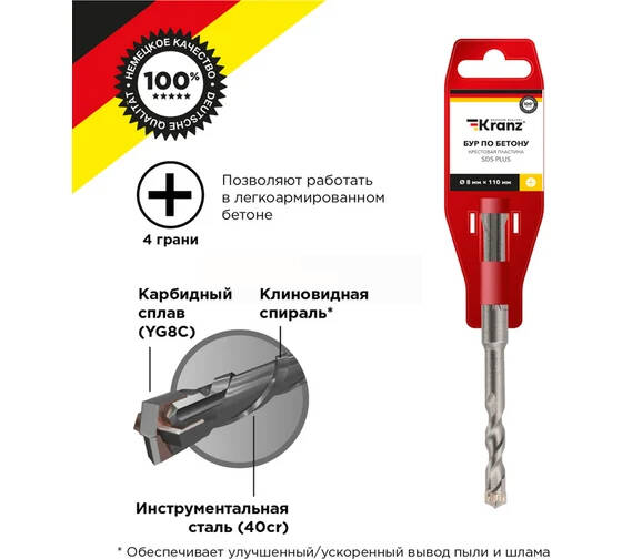 - Бур по бетону 8x110x50мм, крестовая пластина, SDS PLUS KRANZ