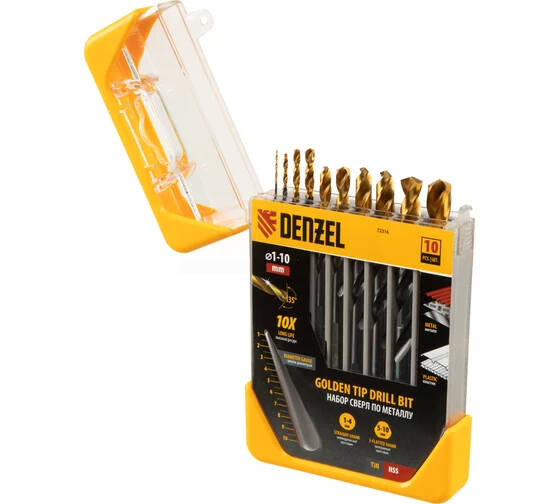 - Набор сверл по металлу Golden Tip 1-10 мм, HSS-Tin, 10 шт Denzel 72316