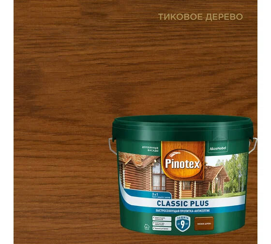 - Пропитка для дерева Pinotex Classic Plus 3 в 1 тиковое дерево 9л